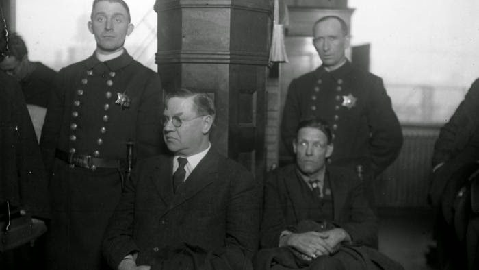 From the Chicago Tribune: "William "Big Bill" Haywood, seated left, in court Jan. 5, 1920, with